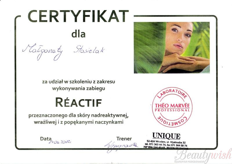 Certyfikat za udział w szkoleniu z zakresu wykonywania zabiegu